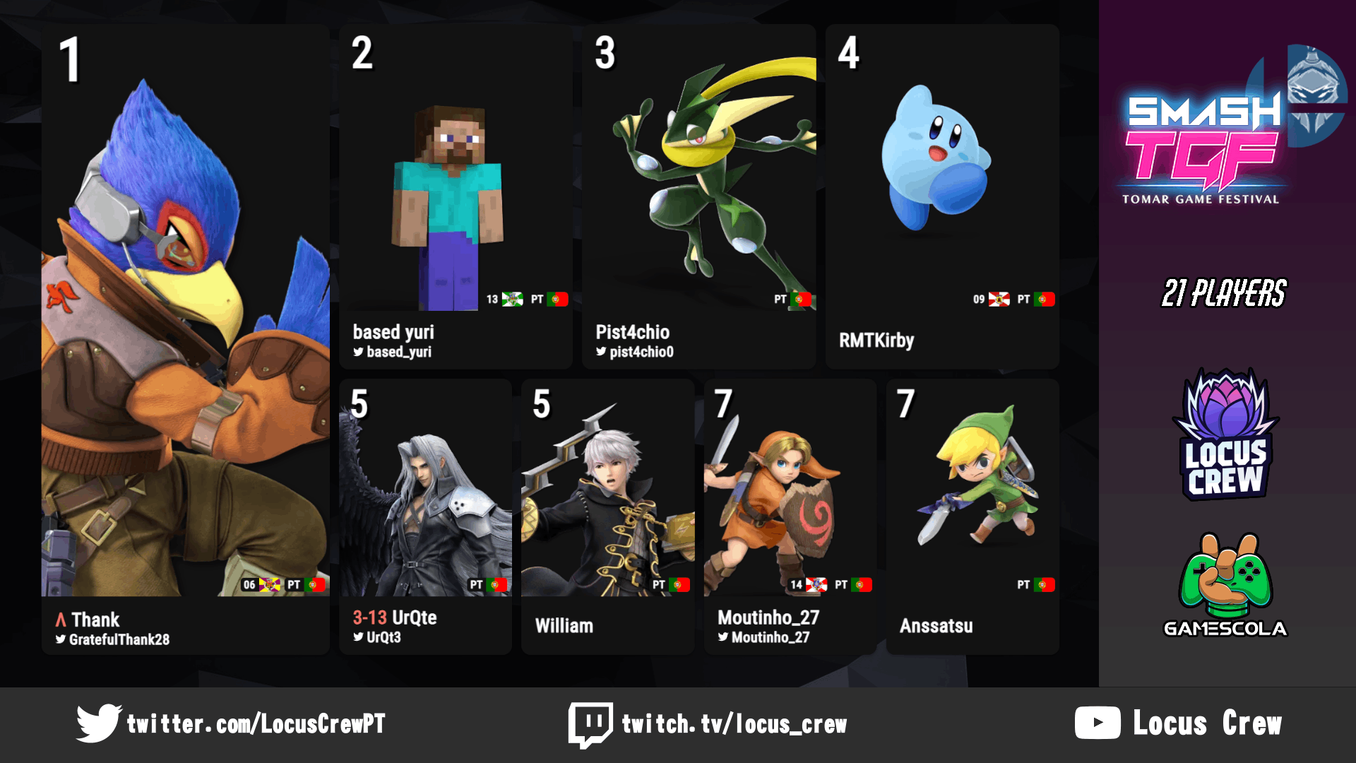 Aqui na Locus Crew, nós gostamos de acabar os nossos eventos em grande. Por isso, guardámos o melhor para o fim – nomeadamente, o torneio singular de SSBU que deteve a maior participação dentro do TGF com 18 inscritos. Este serviu para mostrar uma porção do nível mais alto de SSBU que Portugal tem para oferecer, já que o pódio foi ocupado por Pist4chio, based yuri e, no topo, Thank. Notávelmente, Pist4chio alcançou o terceiro lugar com o seu conhecido e fiável Greninja que não se deixou levar por ninguém exceto os dois que, eventualmente, alcançaram o primeiro e segundo lugar. Um alertada ameaça que o Pist4chio representa em qualquer torneio onde marca presença – onde aparece o ninja, aparece performance.